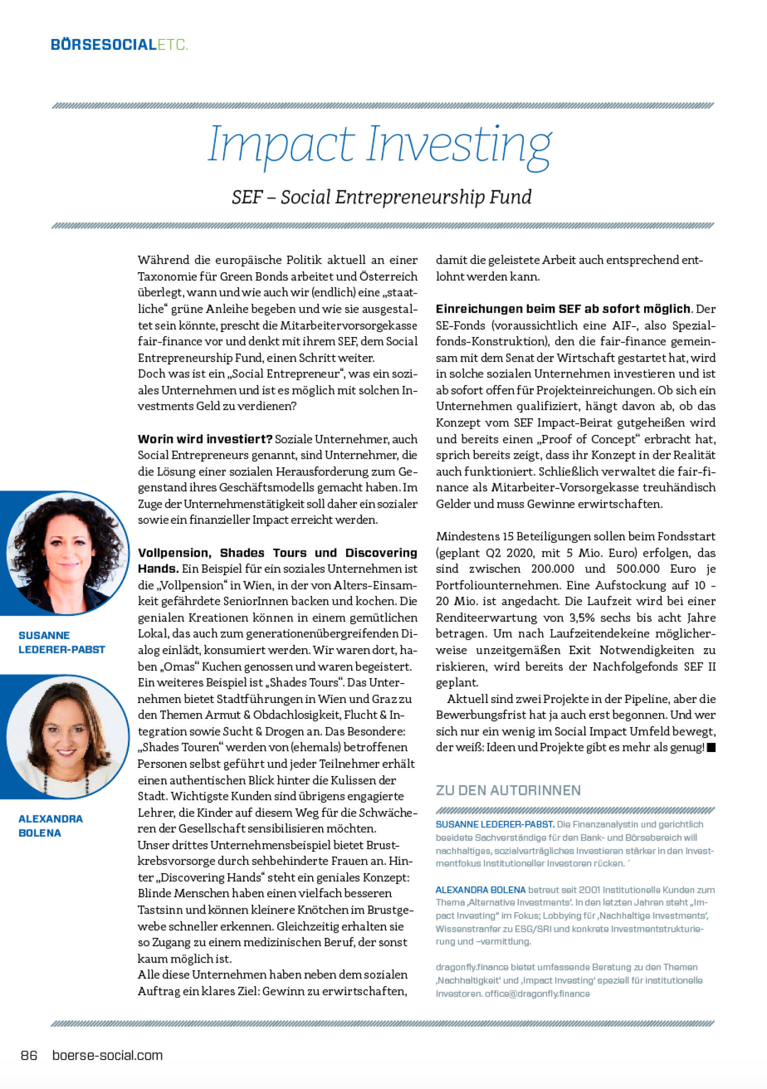 Einreichungen beim SEF ab sofort möglich. Der SE-Fonds (voraussichtlich eine AIF-, also Spezialfonds-Konstruktion), den die fair-finance gemeinsam mit dem Senat der Wirtschaft gestartet hat, wird in solche sozialen Unternehmen investieren und ist ab sofort offen für Projekteinreichungen. Ob sich ein Unternehmen qualifiziert, hängt davon ab, ob das Konzept vom SEF Impact-Beirat gutgeheißen wird und bereits einen „Proof of Concept“ erbracht hat, sprich bereits zeigt, dass ihr Konzept in der Realität auch funktioniert. Schließlich verwaltet die fair-finance als Mitarbeiter-Vorsorgekasse treuhändisch Gelder und muss Gewinne erwirtschaften.