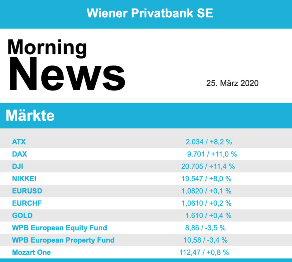 Konjunkturdaten hatten unterdessen in Europa erste tiefe Eindrücke der Pandemie in den Wirtschaftsindikatoren gezeigt, die Einkaufsmanagerindices waren auf Rekordtiefs gefallen. Allerdings kam dies nicht überraschend, und gestern überwog die Meinung, dass die wirtschaftlichen Folgen des Virus bereits weitestgehend eingepreist seien. Europaweit zeigten sich alle Branchen im Plus, sechs sogar im prozentual zweistelligen Bereich. Den größten Sprung nach oben machten der Bergbausektor sowie die konjunktursensible Ölbranche mit einem Plus von jeweils knapp 16,0%. Auch der Auto- und der Versicherungssektor legten kräftig um rund 15,0% zu. Im EuroStoxx 50 belegte Daimler den Spitzenplatz mit einem Plus von 27,3%, auch Volkswagen war stark und konnte sich um 19,1% verbessern. Bei den Versicherern konnte Münchner Rück um 20,2% zulegen, Axa verzeichnete ein Tagesplus von 17,8%. Aktien, die bisher recht glimpflich davongekommen waren, konnten gestern nicht in dem Ausmaß zulegen oder mussten sogar abgeben, der französische Joghurthersteller Danone war mit einem Minus von 1,7% Schlusslicht im Eurostoxx 50,der britische Haushaltsartikelhersteller Reckitt Benckiser musste 1,8% abgeben und der Pharmaproduzent Astra Zeneca konnte nur ein vergleichsweise geringes Plus von 1,9% erzielen. Unibail-Rodamco-Westfield kürzte angesichts der Viruskrise die Prognose und strich die Dividende, nachdem der Titel lange Zeit im Minus gehandelt hatte konnte er zum Schluss doch noch knapp befestigt mit einem Plus von 1,9% den Handel beenden. Der Windkraftanlagenhersteller Nordex erhöhte trotz der Krise dank voller Auftragsbücher seine Ertragsziele, in dem positiven Umfeld liess das die Aktie 33,3% nach oben springen.