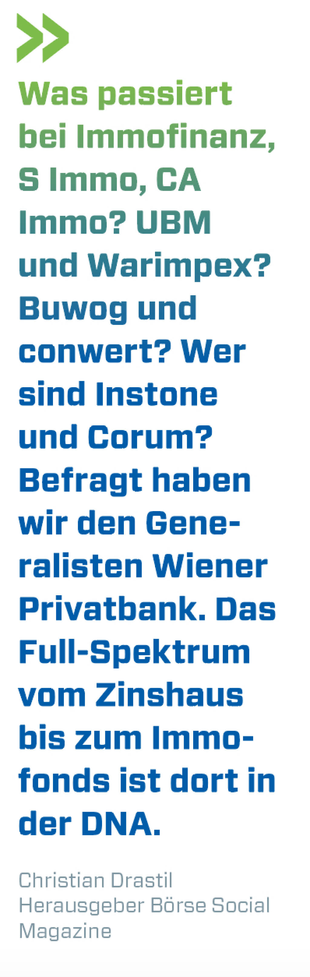 Was passiert bei Immofinanz, S Immo, CA Immo? UBM und Warimpex? Buwog und conwert? Wer sind Instone und Corum? Befragt haben wir den Generalisten Wiener Privatbank. Das Full-Spektrum vom Zinshaus bis zum Immofonds ist dort in der DNA.