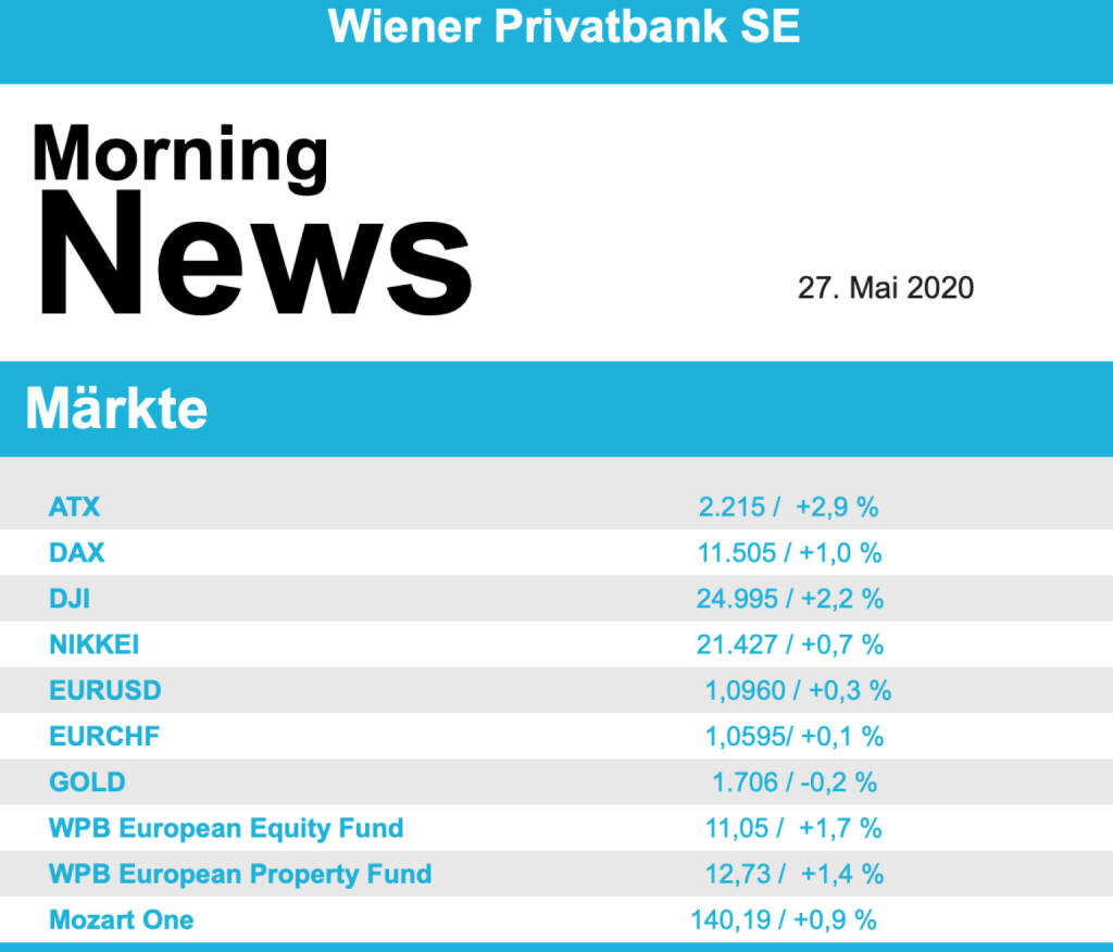 Auch in den USA sorgten die weltweit geplanten Lockerungsmaßnahmen für eine optimistische Stimmung, zusätzlich wurde die Stimmung unter den Verbrauchern wieder deutlich verbessert gemeldet, wenngleich sie etwas hinter den Erwartungen zurückblieb. Da die US-Börsen darüber hinaus noch etwas Nachholbedarf auf Grund des Feiertages hatten, konnte der Dow Jones mit einem Plus von 2,2% schliessen, der S&P 500 konnte sich um 1,2% verbessern, der Nasdaq 100 hingegen drehte im späten Handel ins Minus und schloss mit einem leichten Abschlag von 0,3%. Gesucht waren auch in den USA die Fluglinien, American Airlines verbesserte sich um 14,9%, bei United Airlines sprang der Kurs 16,3% nach oben und Delta Airlines schloss 13,1% befestigt. Auch die Banken wurden stark nachgefragt, Goldman Sachs, JP Morgan, Citigroup und Morgan Stanley erlebten Kursverbesserungen zwischen 7,0% und 9,2%. Der Impfstoffhersteller Novavax will klinische Tests mit seinem Wirkstoffkandidaten gegen Covid-19 aufnehmen, erste Ergebnisse werden im Juli erwartet, die Aktien legten daraufhin um 4,5% zu. Gute Nachrichten gab es auch von Merck & Co, der Pharmakonzern will zwei Impfstoffe gegen das Coronavirus sowie ein Medikament zur Behandlung der Erkrankung entwickeln, nachdem das Unternehmen kürzlich die Rechte zur Entwicklung eines antiviral wirkenden Medikamentes erworben hatte, für die Aktie bedeuteten diese Meldungen einen Anstieg von 1,2%. Der französische Pharmakonzern Sanofi will den Großteil seiner Beteiligung am US-Partner Regeneron loswerden, der Titel erlitt dadurch einen Rückgang um 4,3%.