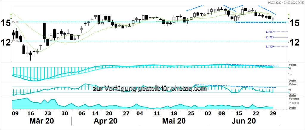 Position: Verkauf 14,80 -> 14,50 – 13,80 – 12,90, Stop 16,20 (-> 16,60 – 17,45). Der Stop dient dazu, die allfällige Fortsetzung des vermeintlichen Ms als Seitwärtstrend abzufangen.