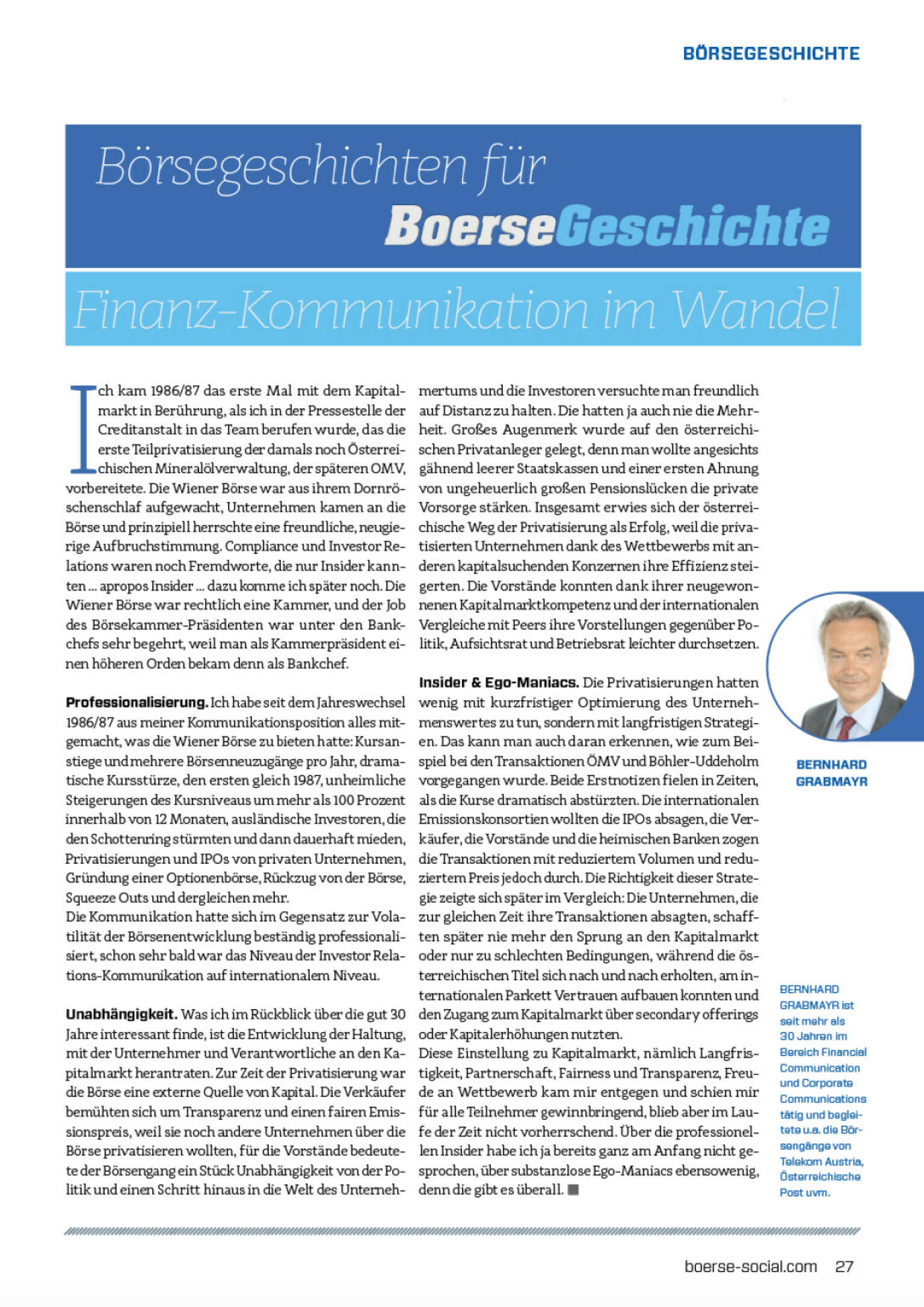 Bernhard Grabmayr ist seit mehr als 30 Jahren im Bereich Financial Communication und Corporate Communications tätig und begleitete u.a. die Börsengänge von Telekom Austria, Österreichische Post uvm.
