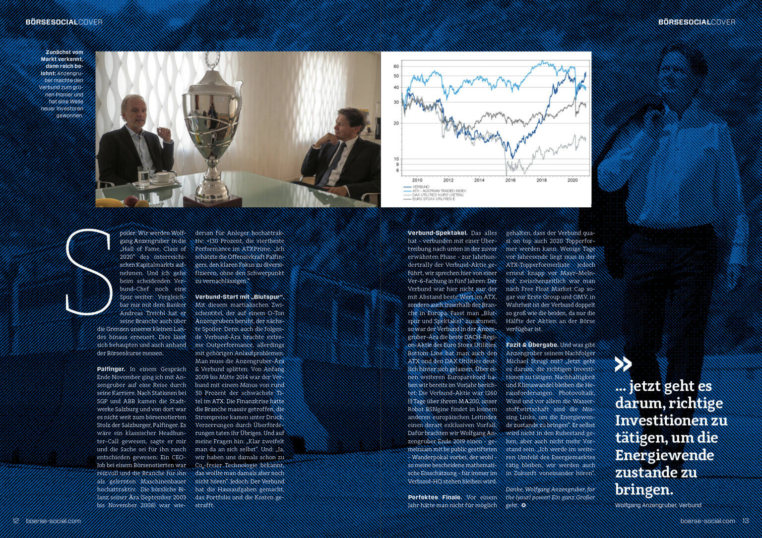 Spoiler: Wir werden Wolfgang Anzengruber in die „Hall of Fame, Class of 2020“ des österreichischen Kapitalmarkts aufnehmen. Und ich gehe beim scheidenden Verbund-Chef noch eine Spur weiter: Vergleichbar nur mit dem Banker Andreas Treichl hat er seine Branche auch über die Grenzen unseres kleinen Landes hinaus erneuert. Dies lässt sich behaupten und auch anhand der Börsenkurse messen.
