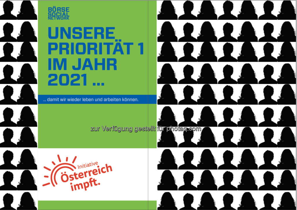 Unter https://www.linkedin.com/in/christiandrastil/ hab ich folgendes gepostet und aktuell 30 Teilnehmer: "DABEI? Meine Priorität 1 im Jahr 2021 ist es, geimpft zu werden. Unsere Firma ist Supporter der "Initiative Österreich impft" geworden. Wer auf dieser Doppelseite mit Foto dabei sein will (kein Name), kommentiert mit "Dabei" bitte. Ich nehme dann einfach Euer LinkedIn-Profilbild und tu Euch auf die geplante Doppelseite der Jubiläumsausgabe 50 unseres Börse Social Magazine. Also: DABEI?“ Bitte weitersagen.