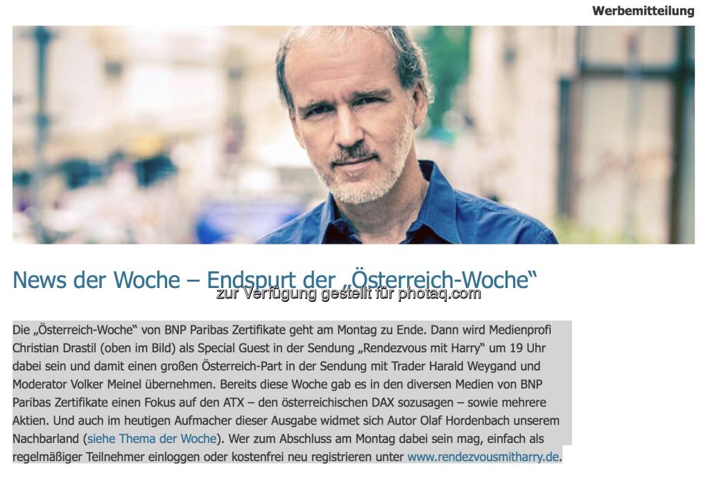 Österreich-Woche bei BNP Paribas: Ich bin heute beim Endspurt der „Österreich-Woche“ von BNP Paribas zu Gast und wurde so anmodiert: "Die „Österreich-Woche“ von BNP Paribas Zertifikate geht am Montag zu Ende. Dann wird Medienprofi Christian Drastil (oben im Bild) als Special Guest in der Sendung „Rendezvous mit Harry“ um 19 Uhr dabei sein und damit einen großen Österreich-Part in der Sendung mit Trader Harald Weygand und Moderator Volker Meinel übernehmen. Bereits diese Woche gab es in den diversen Medien von BNP Paribas Zertifikate einen Fokus auf den ATX – den österreichischen DAX sozusagen – sowie mehrere Aktien. Und auch im heutigen Aufmacher dieser Ausgabe widmet sich Autor Olaf Hordenbach unserem Nachbarland. Wer zum Abschluss am Montag dabei sein mag, einfach als regelmäßiger Teilnehmer einloggen oder kostenfrei neu registrieren unter www.rendezvousmitharry.de."