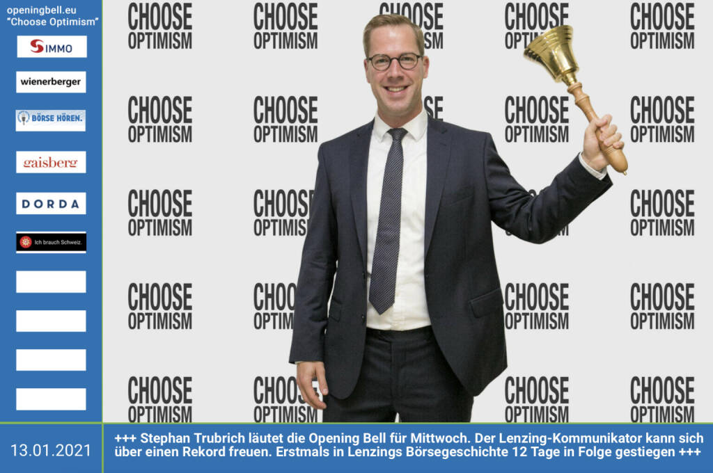 13.1.: Stephan Trubrich läutet die Opening Bell für Mittwoch. Der Lenzing-Kommunikator kann sich über einen Rekord freuen. Erstmals in Lenzings Börsegeschichte ist die Aktie 12 Tage in Folge gestiegen http://www.lenzing.com