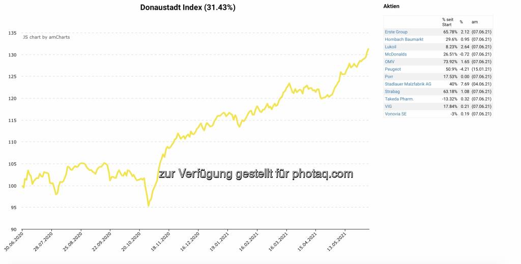 Donaustadt-Index seit Launch mehr als 30 Prozent im Plus: Unter http://www.boerse-social.com/finanzmap haben wir viele Einträge aus Wien Donaustadt, in diesem Bezirk bin ich aufgewachsen und es ist auch der Ort von http://www.sportgeschichte.at . Zusätzlich errechnen wir seit knapp einem Jahr auch einen Donaustadt-Index (Start war per 30.6.2020) mit zwölf Unternehmen gleichgewichtet. Dieser liegt nun bereits mehr als 30 Prozent im Plus. Die 12 Unternehmen sind: Erste Group, Hornbach Baumarkt, Lukoil, McDonalds OMV, Peugeot ,Porr, Stadlauer Malzfabrik AG, Strabag, Takeda Pharm., VIG, Vonovia SE. Alles Player - international und natürlich auch aus Österreich -, die auf den Standort Donaustadt setzen. Vorab: So einen Bezirks-Index gibt es meines Wissens nach europaweit nicht, in Deutschland ist beispielsweise ein Bayern-Index das höchste der Gefühle, aber die Donaustadt hat es sich verdient.
