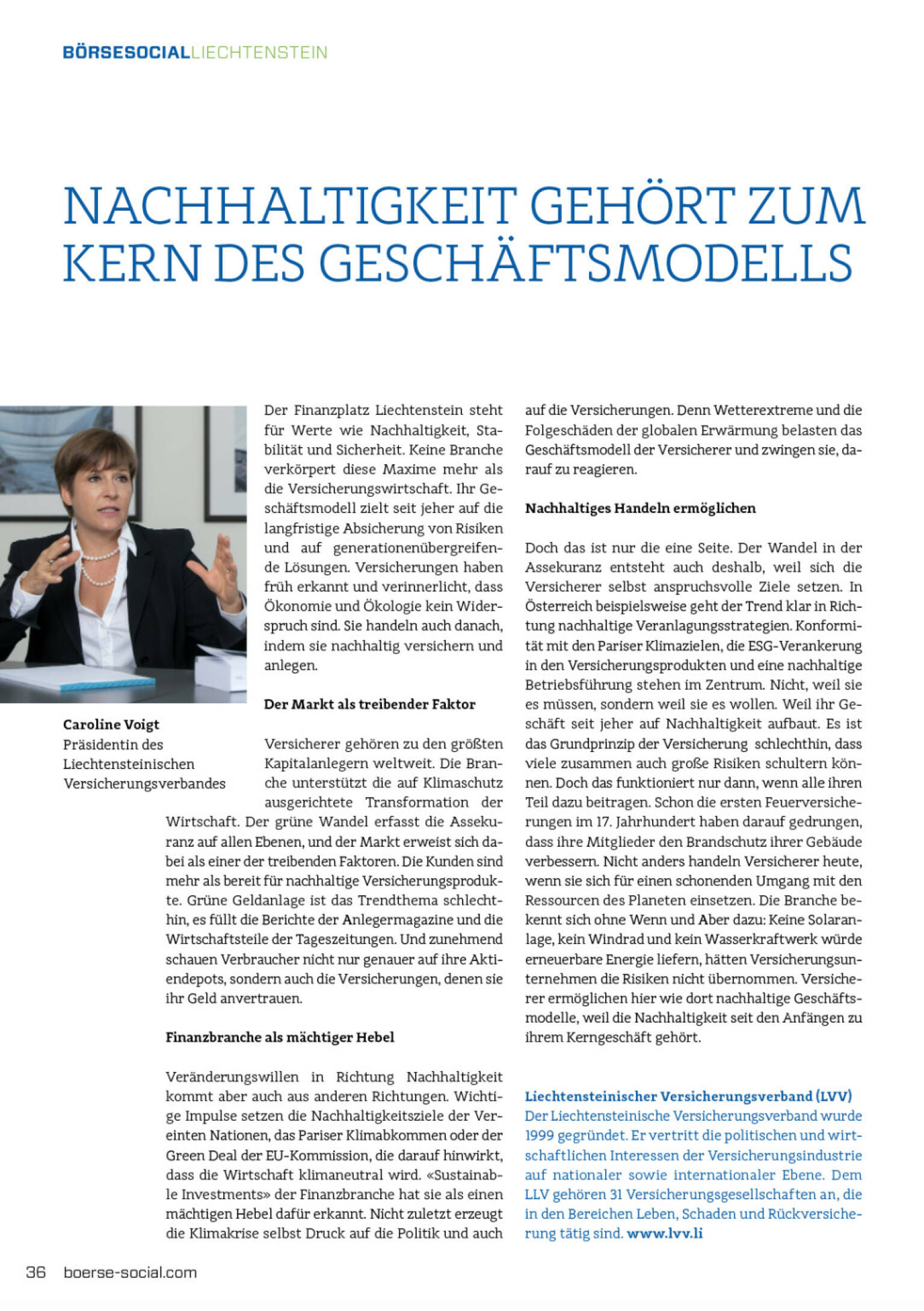 Der Liechtensteinische Versicherungsverband wurde 1999 gegründet. Er vertritt die politischen und wirtschaftlichen Interessen der Versicherungsindustrie auf nationaler sowie internationaler Ebene. Dem LLV gehören 31 Versicherungsgesellschaften an, die in den Bereichen Leben, Schaden und Rückversicherung tätig sind. www.lvv.li