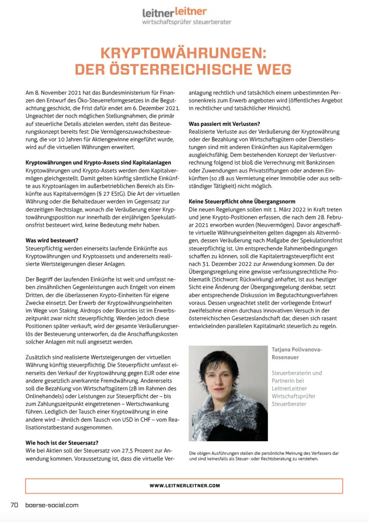 Die neuen Regelungen sollen mit 1. März 2022 in Kraft treten und jene Krypto-Positionen erfassen, die nach dem 28. Februar 2021 erworben wurden (Neuvermögen). Davor angeschaffte virtuelle Währungseinheiten gelten dagegen als Altvermögen, dessen Veräußerung nach Maßgabe der Spekulationsfrist steuerpflichtig ist. Um entsprechende Rahmenbedingungen schaffen zu können, soll die Kapitalertragsteuerpflicht erst nach 31. Dezember 2022 zur Anwendung kommen. Da der Übergangsregelung eine gewisse verfassungsrechtliche Problematik (Stichwort: Rückwirkung) anhaftet, ist aus heutiger Sicht eine Änderung der Übergangsregelung denkbar, setzt aber entsprechende Diskussion im Begutachtungsverfahren voraus. Dessen ungeachtet stellt der vorliegende Entwurf zweifelsohne einen durchaus innovativen Versuch in der österreichischen Gesetzeslandschaft dar, diesen sich rasant entwickelnden parallelen Kapitalmarkt steuerlich zu regeln.