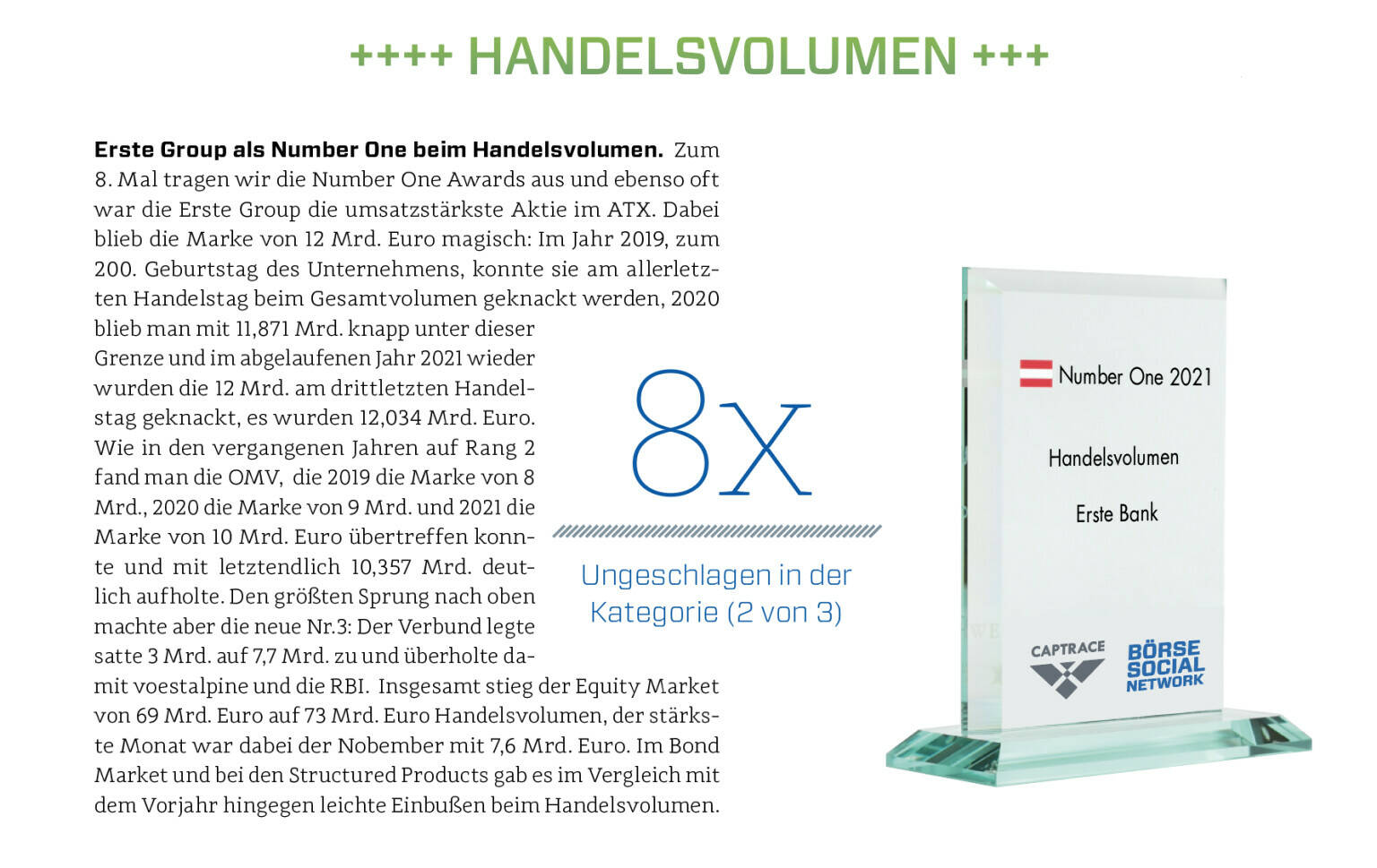 Erste Group als Number One beim Handelsvolumen. Zum 8. Mal tragen wir die Number One Awards aus und ebenso oft war die Erste Group die umsatzstärkste Aktie im ATX. Dabei blieb die Marke von 12 Mrd. Euro magisch: Im Jahr 2019, zum 200. Geburtstag des Unternehmens, konnte sie am allerletzten Handels-tag beim Gesamtvolumen geknackt werden, 2020 blieb man mit 11,871 Mrd. knapp unter dieser Grenze und im abgelaufenen Jahr 2021 wieder wurden die 12 Mrd. am drittletzten Handelstag geknackt, es wurden 12,034 Mrd. Euro. Wie in den vergangenen Jahren auf Rang 2 fand man die OMV, die 2019 die Marke von 8 Mrd., 2020 die Marke von 9 Mrd. und 2021 die Marke von 10 Mrd. Euro übertreffen konnte und mit letztendlich 10,357 Mrd. deutlich aufholte. Den größten Sprung nach oben machte aber die neue Nr.3: Der Verbund legte satte 3 Mrd. auf 7,7 Mrd. zu und überholte damit voestalpine und die RBI. Insgesamt stieg der Equity Market von 69 Mrd. Euro auf 73 Mrd. Euro Handelsvolumen, der stärkste Monat war dabei der Nobember mit 7,6 Mrd. Euro. Im Bond Market und bei den Structured Products gab es im Vergleich mit dem Vorjahr hingegen leichte Einbußen beim Handelsvolumen.