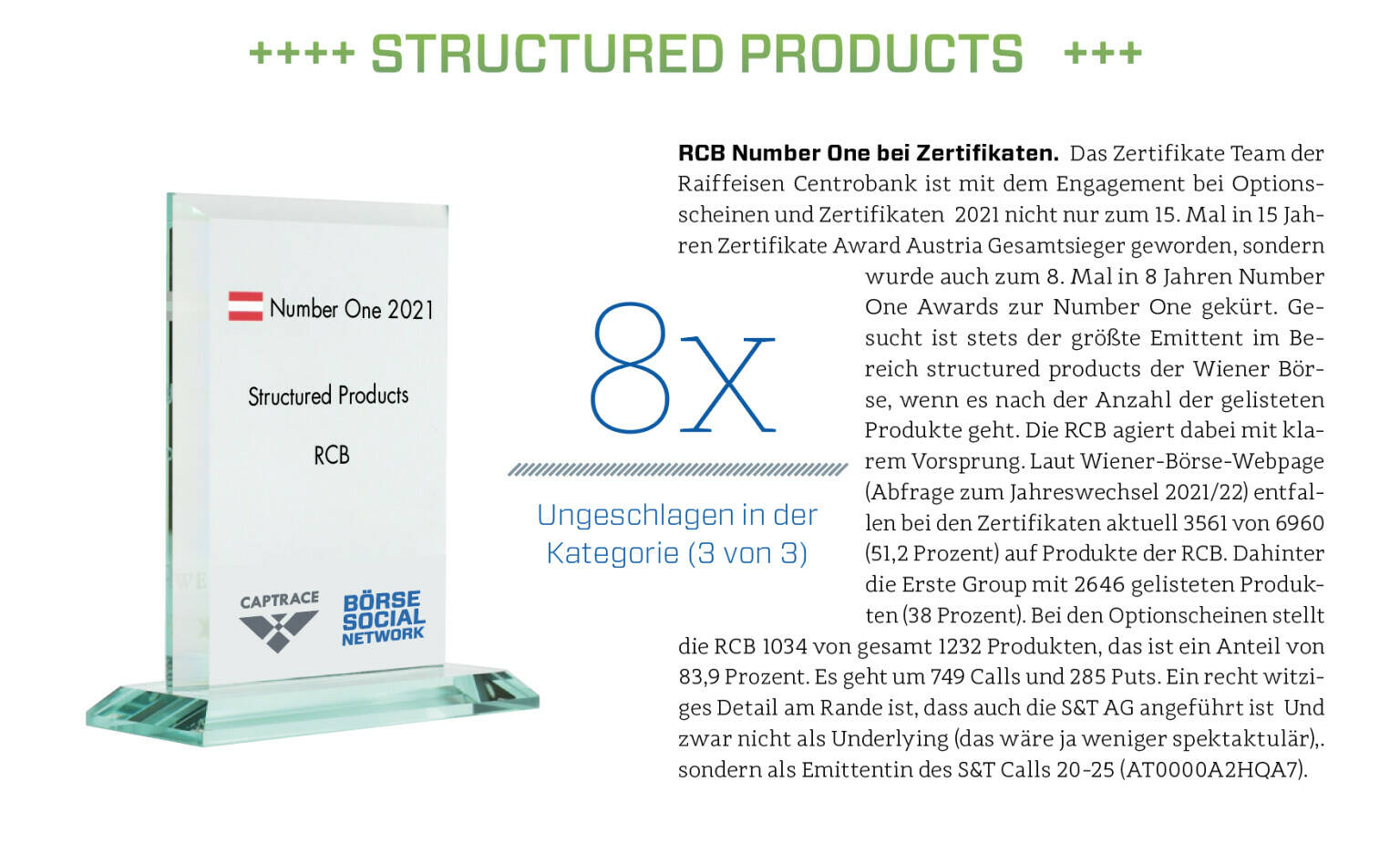 RCB Number One bei Zertifikaten. Das Zertifikate Team der Raiffeisen Centrobank ist mit dem Engagement bei Optionsscheinen und Zertifikaten 2021 nicht nur zum 15. Mal in 15 Jahren Zertifikate Award Austria Gesamtsieger geworden, sondern wurde auch zum 8. Mal in 8 Jahren Number One Awards zur Number One gekürt. Gesucht ist stets der größte Emittent im Bereich structured products der Wiener Börse, wenn es nach der Anzahl der gelisteten Produkte geht. Die RCB agiert dabei mit klarem Vorsprung. Laut Wiener-Börse-Webpage (Abfrage zum Jahreswechsel 2021/22) entfallen bei den Zertifikaten aktuell 3561 von 6960 (51,2 Prozent) auf Produkte der RCB. Dahinter die Erste Group mit 2646 gelisteten Produkten (38 Prozent). Bei den Optionscheinen stellt die RCB 1034 von gesamt 1232 Produkten, das ist ein Anteil von 83,9 Prozent. Es geht um 749 Calls und 285 Puts. Ein recht witziges Detail am Rande ist, dass auch die S&T AG angeführt ist Und zwar nicht als Underlying (das wäre ja weniger spektaktulär),. sondern als Emittentin des S&T Calls 20-25 (AT0000A2HQA7).