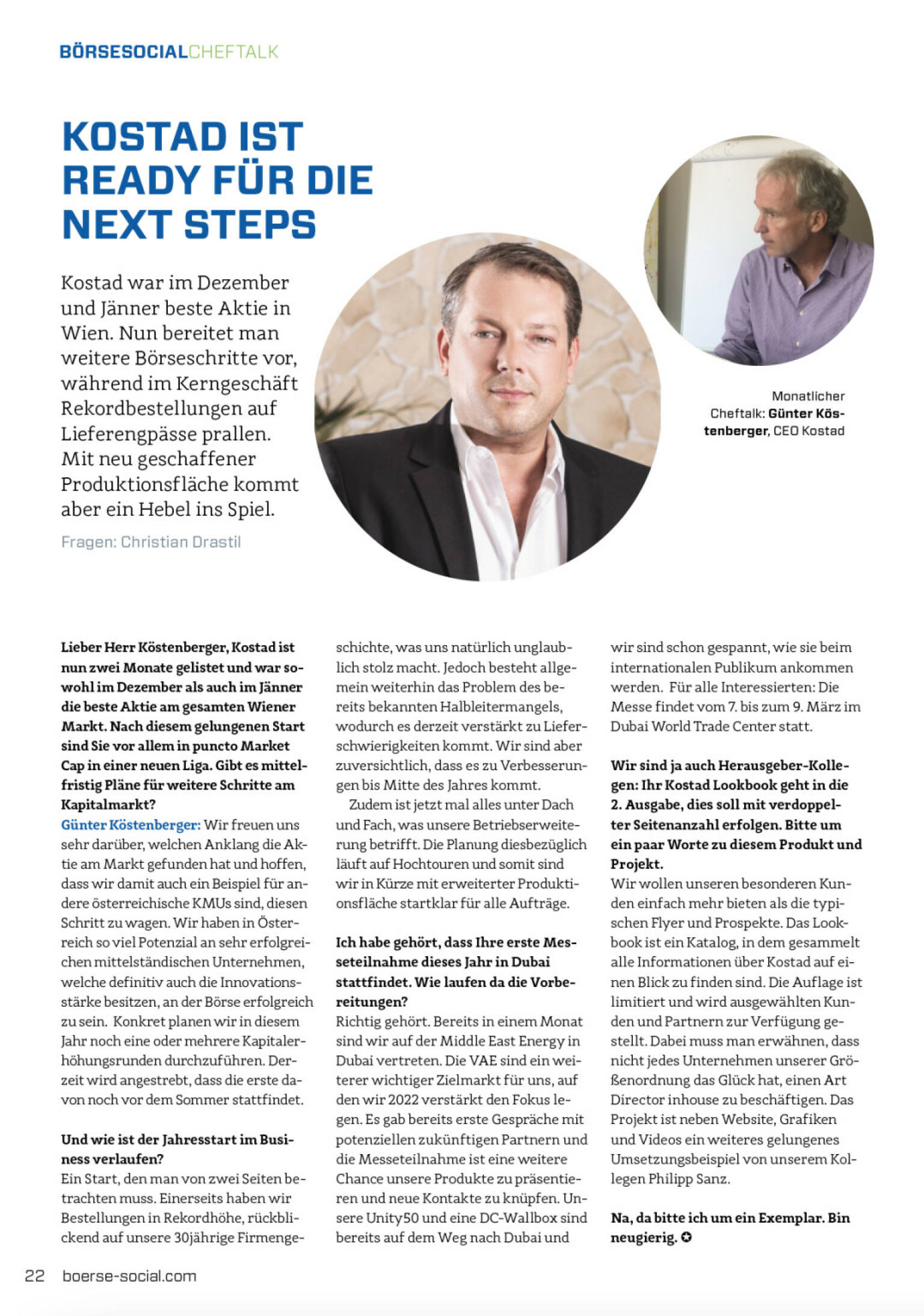 Lieber Herr Köstenberger, Kostad ist nun zwei Monate gelistet und war sowohl im Dezember als auch im Jänner die beste Aktie am gesamten Wiener Markt. Nach diesem gelungenen Start sind Sie vor allem in puncto Market Cap in einer neuen Liga. Gibt es mittelfristig Pläne für weitere Schritte am Kapitalmarkt?