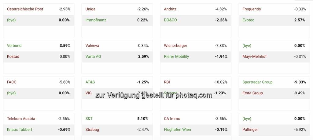Aktien auf dem Radar:Bawag, FACC, Amag, Austriacard Holdings AG, Polytec Group, Kapsch TrafficCom, Rosgix, Mayr-Melnhof, Strabag, AT&S, Gurktaler AG Stamm, Hutter & Schrantz Stahlbau, Marinomed Biotech, SBO, Wiener Privatbank, RHI Magnesita, BKS Bank Stamm, Oberbank AG Stamm, CA Immo, EuroTeleSites AG, EVN, Flughafen Wien, CPI Europe AG, OMV, Bajaj Mobility AG, Österreichische Post, Telekom Austria, UBM, Verbund, Lenzing, American Express.