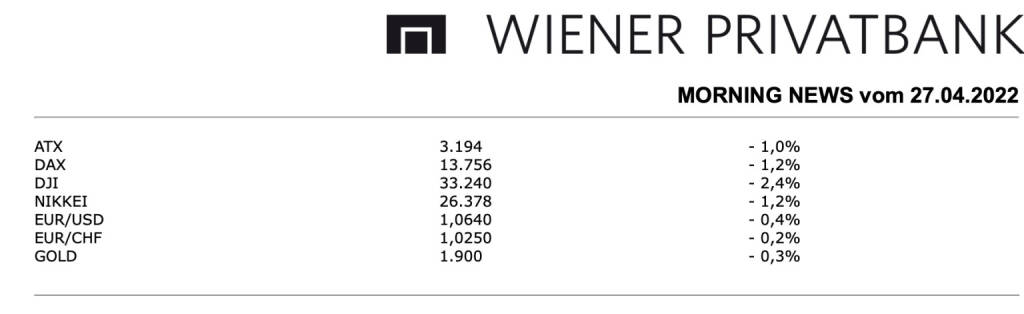 Aus den Morning News der Wiener Privatbank: Der heimische Markt drehte im Späthandel ins Minus, nachdem der ATX sich über weite Strecken des Tages im positiven Bereich halten konnte musste er gegen Ende hin nachgeben und ging mit einem Rückgang von 1,0% aus dem Handel. Für Impulse sorgten in Wien die Ergebnisse heimischer Firmen, Mayr Melnhof lieferte allgemein Zahlen, die über den Erwartungen ausfielen, vor allem die erfolgreiche Weitergabe von erhöhten Rohstoffkosten mittels Preiserhöhungen wurde von den Analysten gelobt, nachdem die Aktie zunächst zulegen konnte, drehte sie dann mit dem breiten Markt ins Minus und endete mit einem Abschlag von 1,8%. Auch die Bawag öffnete ihre Bücher, die Bank hat für das erste Quartal einen um die Hälfte auf 111 Millionen gesteigerten Nettogewinn gemeldet, die Zahlen lagen insgesamt leicht über den Erwartungen, brachten aber keine wesentlichen Überraschungen, die Aktie musste 1,1% nachgeben.