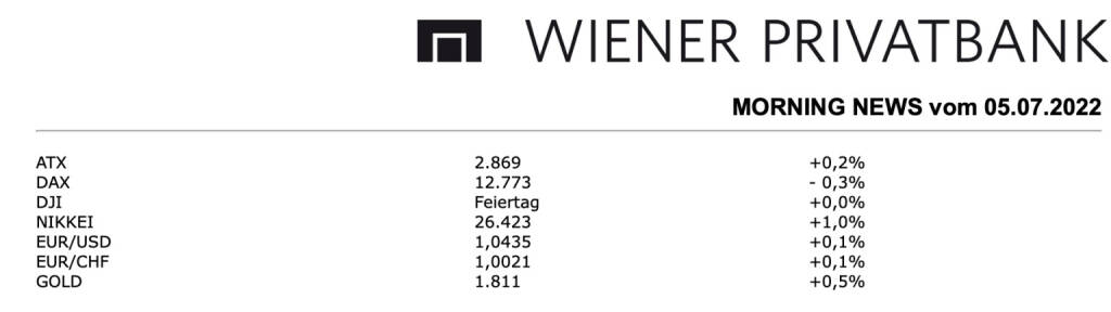 Aus den Morning News der Wiener Privatbank: Nach einer dreitägigen Verlustserie konnte der ATX gestern leicht befestigt mit einem Plus von 0,2% aus dem Handel gehen. In einem ruhigen Geschäft boten schwache Konjunkturdaten aus der Eurozone keinen Gegenwind, der von der Investment-Beratungsfirma Sentix erhobene Stimmungsindex trübte sich sichtlich ein, er fiel von minus 15,8 Zählern im Juni auf minus 26,4 Punkte im Juli und damit auf den niedrigsten Wert seit Mai 2020. Impulse aus den USA waren gestern kein Thema, die Wall Street blieb feiertagsbedingt wegen des Independence Day geschlossen. Besonders stark waren die Ölwerte, für Schoeller-Bleckmann ging es um 7,7% nach oben, womit sich der Titel an die Spitze der Kursübersicht setzen konnte, OMV konnte sich von dem schwachen Handel am Freitag mit einem Plus von 2,7% erholen. Weniger erfolgreich lief der Handel für die großen Banken, Bawag war die positive Ausnahme und konnte sich um 1,8% verbessern, für die Erste Group ging es um 0,1% nach unten, die Raiffeisen Bank International musste 1,3% nachgeben. Nach unten ging es für die Versorger im Zuge der europaweiten Schwäche des Sektors, EVN endete mit einem Rückgang von 1,9%, der Verbund konnte sich etwas besser halten, musste aber ebenfalls 0,5% nachgeben. Schwach waren auch die Bauunternehmen, für Strabag gab es ein Minus von 0,7%, Porr musste gleich um 3,1% nachgeben. Ans untere Ende der Kursübersicht rutschte Marinomed, für das Biotechnologieunternehmen ging es um 3,2% nach unten, auch Rosenbauer hatte wieder einmal einen eher schwachen Tag, der Feuerwehrausrüster ging um 2,5% schwächer aus dem Handel. Gut nachgefragt war Polytec, der Autozulieferer war mit einem Plus von 5,3% einer der stärksten Titel des Handels, auch UBM Development war gut nachgefragt, der Immobilienentwickler verzeichnete einen Anstieg von 2,9%. Gekauft wurde auch voestalpine, für den Stahlkonzern ging es um 2,3% nach oben, auch die Addiko Bank war gesucht, für das kleinere Finanzinstitut brachte der Handel eine Verbesserung von 1,9%.