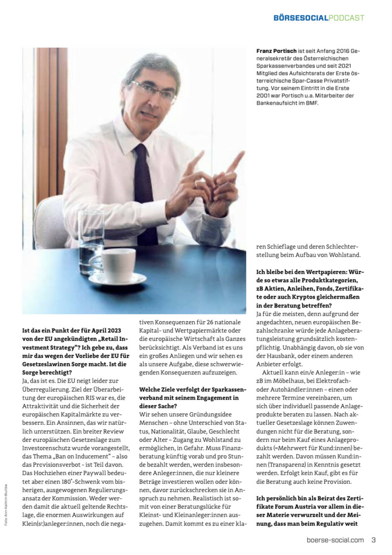 Die EU plant ein europaweites Provisionverbot für die Kapitalanlage - ein Modell, das derzeit nur in NL und GB eingesetzt wird und Studien zufolge nicht funktioniert. Denn: Es löst kostenpflichtige Beratungsgespräche aus, die sich vor allem Privatanleger nicht mehr leisten wollen. Diese Paywall gefällt Franz Portisch, Generalsekretär des Österreichischen Sparkassenverbandes gar nicht. Im Interview erklärt er ausführlich das Warum.