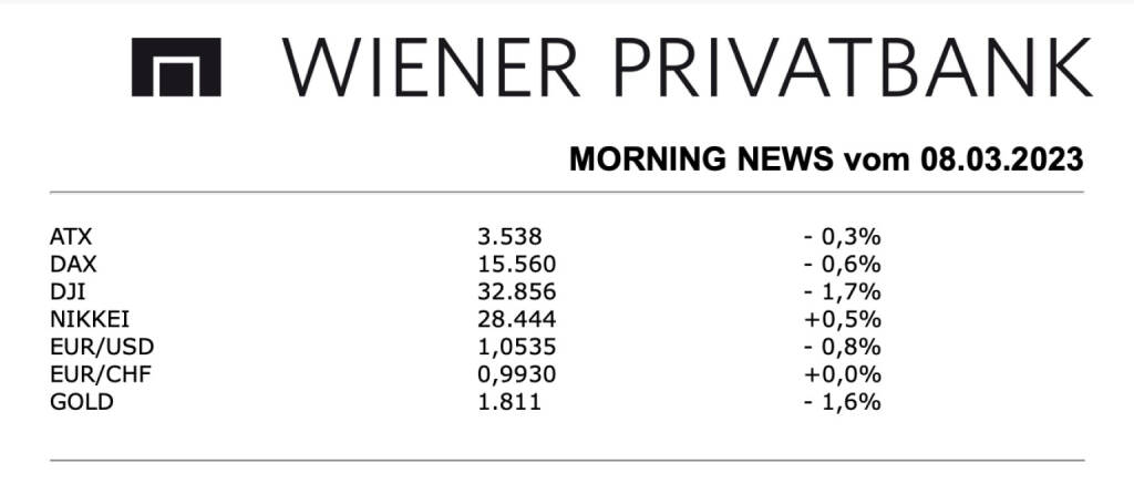 Aus den Morning News der Wiener Privatbank: "Mit leichten Abgaben ist der heimische Markt gestern aus dem Handel gegangen, die Verluste waren aber niedriger als beim europäischen Umfeld, der ATX musste mit einem kleinen Abschlag von 0,3% schliessen. Am Nachmittag hatten Aussagen des Fed-Chefs Jerome Powell die Stimmung unter den Investoren etwas gedrückt, er hält nach einer Verringerung des Zinserhöhungstempos künftig wieder größere Zinsschritte für möglich. Laut seinen Aussagen ist es noch ein weiter Weg bis zu einer Rückkehr zu einer Inflationsrate von zwei Prozent, und dieser Weg wird wahrscheinlich holprig sein.