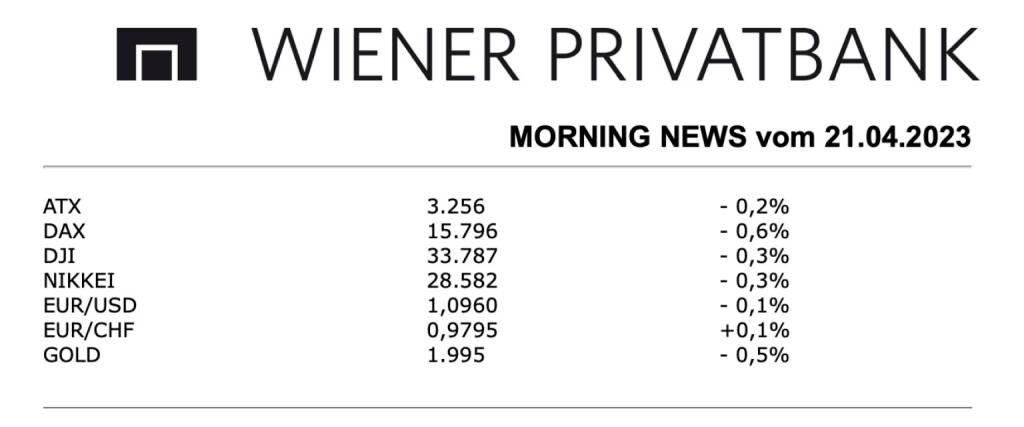 Aus den Morning News der Wiener Privatbank: "Der Wiener Aktienmarkt hat den Handel am Donnerstag mit leichten Verlusten beendet, der ATX schloss mit einem Minus von 0,2%. Die heimische Börse war somit im Gleichklang mit den großen europäischen Börsen und der Wall Street, wo ebenfalls die negativen Vorzeichen überwogen. Neben unerwartet schwachen US-Konjunkturnachrichten wurden international zudem die Gewinnzahlen des US-Elektroautobauers Tesla mit Enttäuschung aufgenommen. Bei den Einzelwerten gab es wieder wenig signifikante neue Meldungen, bereits am Vorabend hatte KapschTrafficCom die Erwartungen für das Geschäftsjahr 2022/23 zurückgeschraubt, das Unternehmen erwartet nun wegen Einmaleffekten nur mehr ein Betriebsergebnis im einstelligen Millionen-Euro-Bereich, nachdem zuvor ein deutlich höheres Ebit als im Vorjahreszeitraum, wo 11 Millionen Euro erwirtschaftet werden konnten, anvisiert worden war, die Aktie reagierte auf diese Gewinnwarnung mit einem Abschlag von 4,0%.