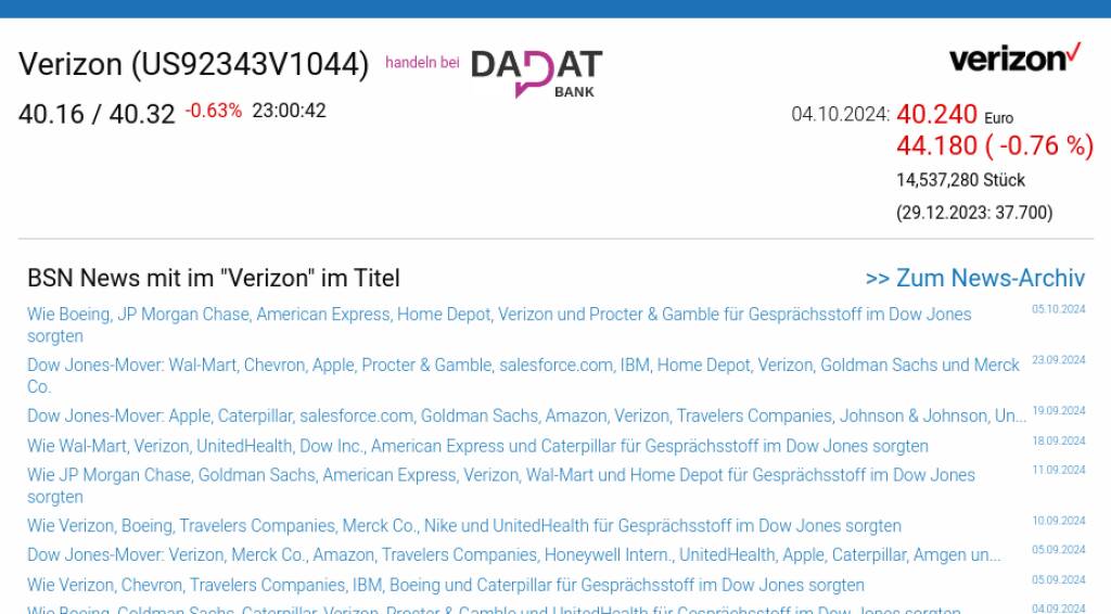 Verizon am 4.10. -0,76%, Volumen 77% normaler Tage