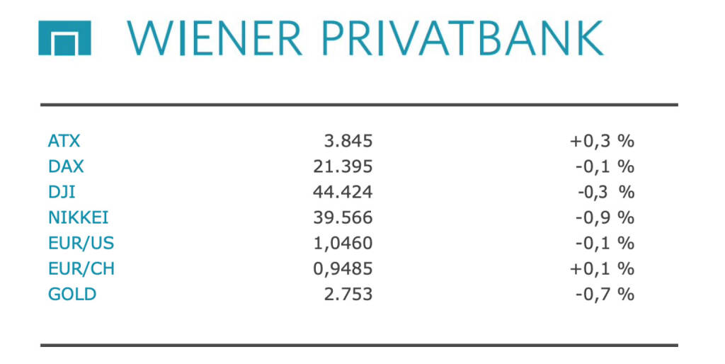 Aus den Morning News der Wiener Privatbank: "Die Wiener Börse hat am Freitag mit kleinen Gewinnen geschlossen. Der ATX beendete den Tag mit einem Plus von 0,28 Prozent bei 3.845,21 Punkten. Auch andere Börsen in Europa zeigten sich wenig bewegt. Das bestimmende Thema war weiter die Wirtschaftspolitik des neuen US-Präsidenten Donald Trump. Viele Anleger hoffen auf eine wirtschaftsfreundliche Politik des neuen Präsidenten. Die Ängste vor einem gleichzeitig drohenden Handelskrieg dürften hingegen zuletzt etwas gewichen sein, insbesondere nachdem Trump zuletzt etwas behutsamere Töne angeschlagen hat. So sagte Trump zuletzt über die angedachten Zölle auf chinesische Waren: "Sie wollen sie nicht, und ich würde sie lieber nicht einsetzen müssen." Marktteilnehmer werteten dies als Hoffnungsschimmer, dass Trump womöglich von Zöllen ablassen könnte. Gestützt wurden die Börsen am Freitag auch von guten Wirtschaftsdaten aus der Eurozone. Die Wirtschaft der Eurozone hat zu Jahresbeginn erstmals seit dem vergangenen Sommer wieder ein kleines Wachstum geschafft. Der von S&P Global in Unternehmensumfragen ermittelte Einkaufsmanagerindex stieg im Januar überraschend kräftig um 0,6 auf 50,2 Punkte und liegt damit erstmals seit August wieder über der Wachstumsschwelle von 50 Punkten. Der Index liegt zwar immer noch auf einem niedrigen Niveau. Der erneute Anstieg macht aber Hoffnung, dass sich die Wirtschaft nach einem schwachen vierten Quartal 2024 im neuen Jahr etwas beleben wird.