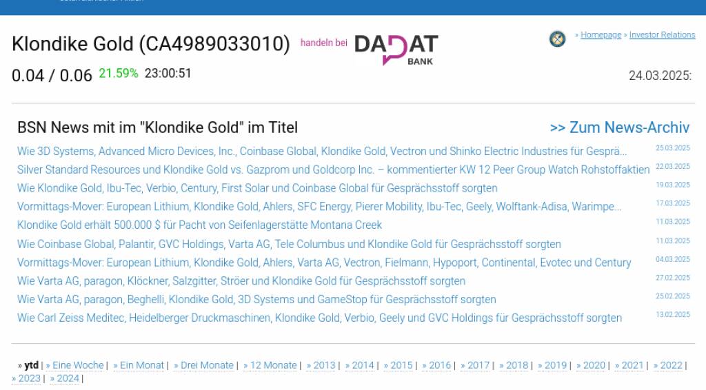 Klondike Gold am 24.3. -6,82%, Volumen 0% normaler Tage