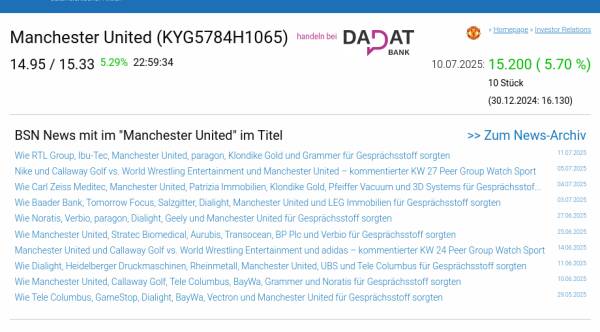 Manchester United am 10.7. 5,70%, Volumen 10% normaler Tage