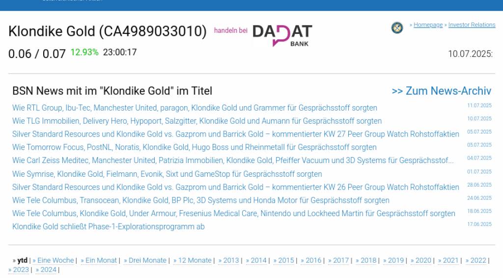 Klondike Gold am 10.7. -5,17%, Volumen 0% normaler Tage