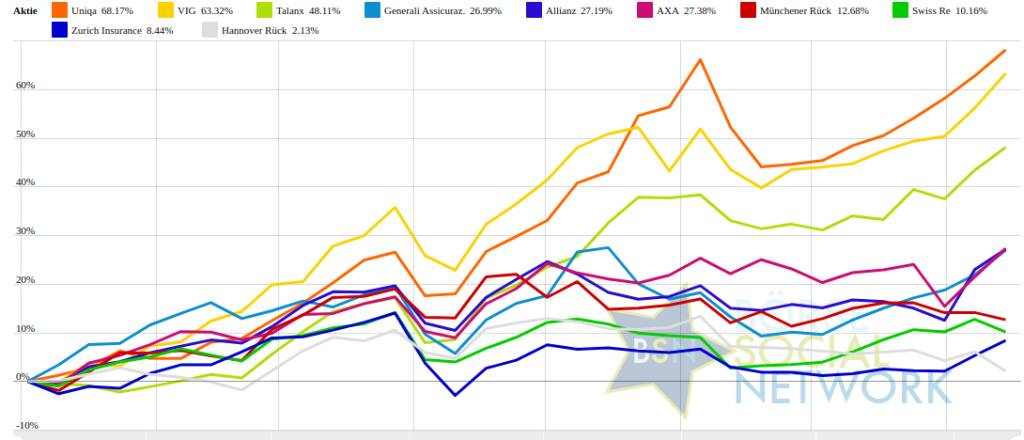 Die Durchschnittsperformance ytd der BSN-Group Versicherer ist 30,36% und reiht sich damit auf Platz 6 ein: