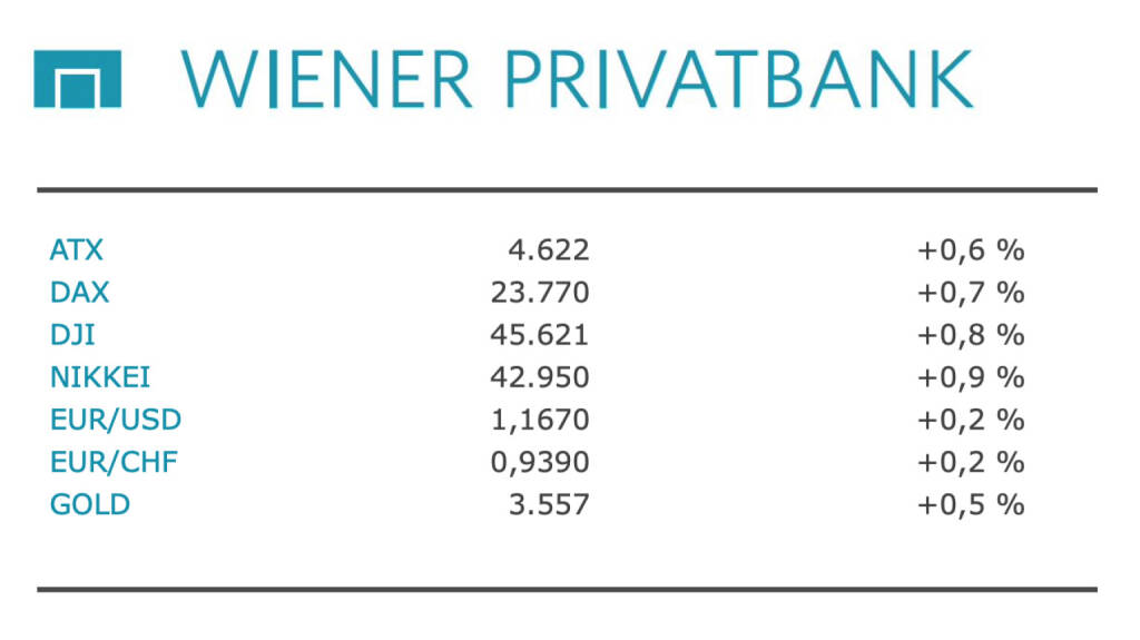 Aus den Morning News der Wiener Privatbank: "Die zur Wochenmitte begonnene Stabilisierung am Wiener Aktienmarkt hat gestern Donnerstag etwas an Fahrt aufgenommen. Zum Handelsende stand der ATX 0,55 Prozent im Plus bei 4.622,04 Punkten. Für den ATX Prime ging es 0,56 Prozent auf 2.304,67 Zähler hoch. Zuletzt hatten die Unsicherheiten rund um die Zollpolitik des US-Präsidenten, ausbleibende Erfolge im Ringen um einen Frieden in der Ukraine sowie die Sorgen vor der hohen Staatsverschuldung in mehreren großen Volkswirtschaften die Anleger wieder aus dem Risiko gehen lassen. Dies zeigte sich zu Wochenbeginn insbesondere durch steigende Renditen an den Anleihemärkten. Vor diesem Hintergrund kam der ATX weiter von seinem Jahreshoch von Mitte August zurück bis an die 50-Tage-Linie, einem viel beachteten mittelfristigen Trendindikator.