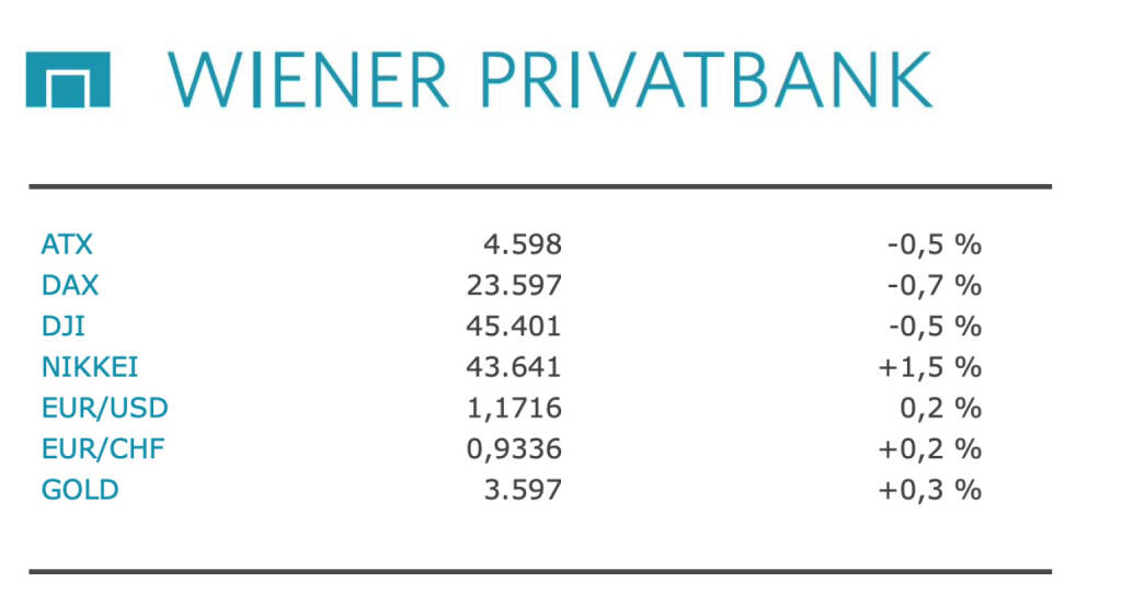 Aus den Morning News der Wiener Privatbank: "Die Wiener Börse hat am Freitag nachgegeben. Nach einem überwiegend freundlichen Verlauf erwies sich der schwach ausgefallene US-Arbeitsmarktbericht letztlich als deutlicher Belastungsfaktor. Dieser bestärkte zwar die Zinssenkungsfantasien, nährte jedoch auch die Sorgen vor einer Abkühlung der US-Konjunktur. Mit diesem Dämpfer im jüngsten Erholungsversuch fiel der ATX um 0,53 Prozent auf 4.597,61 Punkte wieder bis knapp an die 50-Tage-Linie für den mittelfristigen Trend zurück. Auf Wochensicht büßte der Leitindex 0,4 Prozent ein. Der ATX Prime verlor zum Wochenausklang 0,47 Prozent auf 2.293,95 Zähler. Ein ähnliches Bild gab das europäische Umfeld ab.