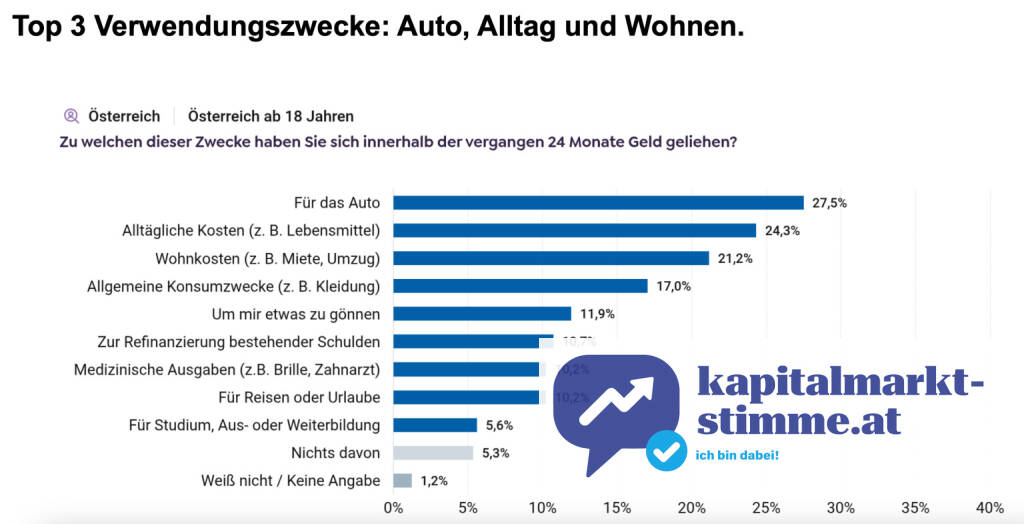 Am häufigsten leihen sich die Menschen Geld, um den Alltag und Konsum zu finanzieren. Das Auto (28%) führt das Ranking der Hauptmotive an, dicht gefolgt von alltäglichen Kosten wie Lebensmitteln (23%) oder Wohnen (z.B. Miete oder Umzug) (21%). Etwas mehr als jeder Zehnte nutzt Finanzierungen auch, um sich etwas zu gönnen (12%), für medizinische Ausgaben oder zu verreisen (jeweils 10%). 30- bis 39-Jährige haben sich überdurchschnittlich häufig Geld geliehen, um ihre Wohnkosten damit zu decken. In Familien mit ein oder zwei Kindern wird ein Großteil des geliehenen Geldes für die Begleichung von Wohnkosten genutzt, in Haushalten mit mindestens drei Kindern wiederum insbesondere für das Auto.