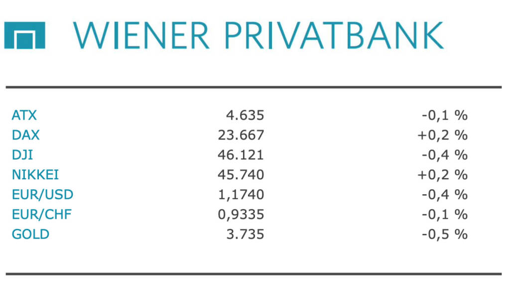 Aus den Morning News der Wiener Privatbank: "Der Wiener Aktienmarkt hat sich gestern Mittwoch knapp im Minus aus dem Handel verabschiedet. Der österreichische Leitindex ATX büßte zum Sitzungsende dünne 0,14 Prozent auf 4.635,11 Punkte ein, nachdem er im Späthandel die Abschläge etwas eingedämmte hatte. Auch an den europäischen Leitbörsen gab es kurz vor dem Ende einen Stimmungsaufschwung zu sehen und die Indizes verbuchten teilweise sogar Zuwächse. Enttäuschende Konjunkturnachrichten aus Deutschland lieferten kaum sichtbare Auswirkungen auf das Börsenparkett. Die Stimmung in der führenden europäischen Volkswirtschaft hat sich erstmals seit einem halben Jahr verschlechtert und der Hoffnung auf eine Konjunkturerholung einen Dämpfer versetzt. Das Ifo-Geschäftsklima ist im September überraschend gesunken, nachdem Volkswirte im Vorfeld einen Anstieg erwartet hatten. Die Meldungslage am österreichischen Markt war wie am Vortag sehr dünn. Weder von Unternehmens- noch von Analystenseite lagen Neuigkeiten vor. Bei den im ATX schwergewichteten Bankenwerten gab es keinen einheitlichen Richtungstrend zu sehen. Die Aktionäre der Bawag mussten ein Minus in Höhe von 1,7 Prozent verbuchen. Raiffeisen Bank International verloren 0,1 Prozent. Die Papiere der Erste Group schlossen hingegen mit plus 0,2 Prozent. Im Technologiebereich konnten die AT&S-Anteilsscheine um 1,8 Prozent zulegen. Die Frequentis-Titel zogen bei geringen Handelsumsätzen um 4,8 Prozent hoch. Unter den Immobilienwerten gewannen CPI Europe 1,8 Prozent an Wert. CA Immo wiesen ein Plus von 0,5 Prozent auf. Die Papiere des Ziegelherstellers Wienerberger sanken um 1,5 Prozent. Telekom Austria schwächten sich um 2,2 Prozent ab."