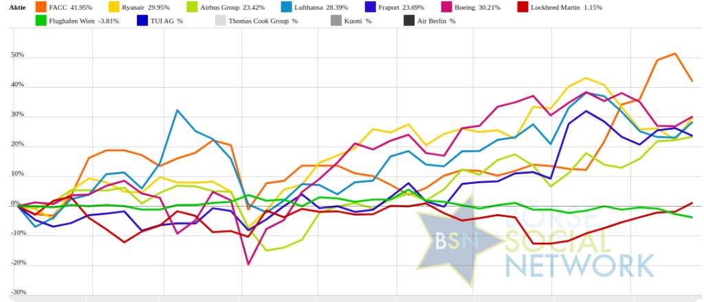Weitere Highlights: Lufthansa ist nun 4 Tage im Plus (5,82% Zuwachs von 7,32 auf 7,75), ebenso Thomas Cook Group 3 Tage im Minus (99,89% Verlust von 4,5 auf 0,01), TUI AG 3 Tage im Minus (6,34% Verlust von 1,99 auf 1,86), FACC 3 Tage im Minus (5,86% Verlust von 9,39 auf 8,84).