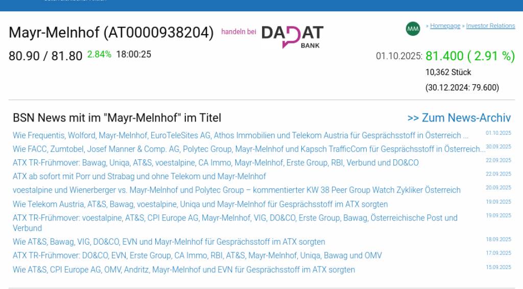 Mayr-Melnhof am 1.10. 2,91%, Volumen 103% normaler Tage
