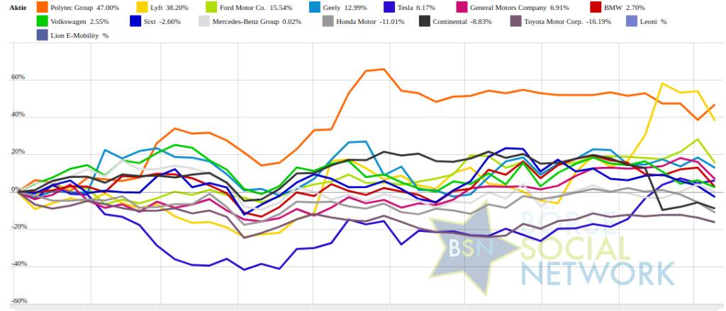 Weitere Highlights: Sixt ist nun 5 Tage im Minus (5,82% Verlust von 81,55 auf 76,8), ebenso General Motors Company 5 Tage im Minus (7,95% Verlust von 60,13 auf 55,35), Lyft 5 Tage im Minus (12,78% Verlust von 22,61 auf 19,72), Continental 4 Tage im Minus (4,47% Verlust von 59,08 auf 56,44), Ford Motor Co. 4 Tage im Minus (10,16% Verlust von 12,7 auf 11,41), Leoni 3 Tage im Minus (77,69% Verlust von 0,13 auf 0,03), Volkswagen 3 Tage im Minus (3,81% Verlust von 94,45 auf 90,85), Toyota Motor Corp. 3 Tage im Minus (5,82% Verlust von 16,99 auf 16), Honda Motor 3 Tage im Minus (8,86% Verlust von 9,23 auf 8,41).