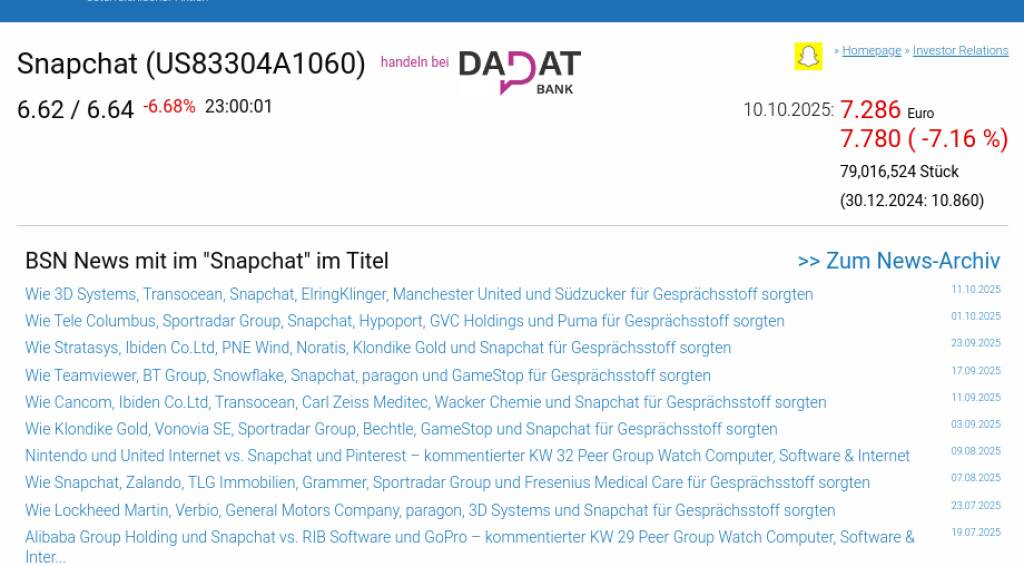 Snapchat am 10.10. -7,16%, Volumen 149% normaler Tage