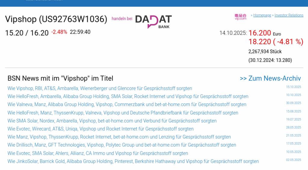 Vipshop am 14.10. -4,81%, Volumen 67% normaler Tage