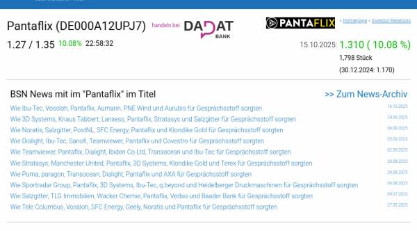 Pantaflix am 15.10. 10,08%, Volumen 84% normaler Tage