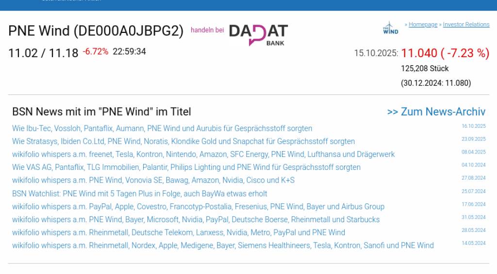 PNE Wind am 15.10. -7,23%, Volumen 171% normaler Tage