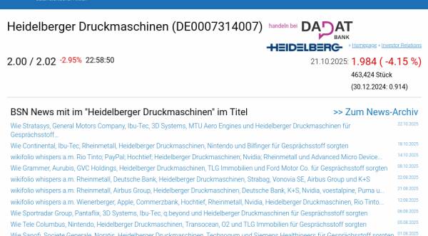 Heidelberger Druckmaschinen am 21.10. -4,15%, Volumen 52% normaler Tage