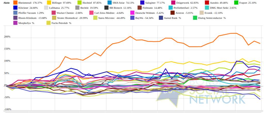 Year-to-date lag per letztem Schlusskurs Rheinmetall 176,85% (Vorjahr: 114,15 Prozent) im Plus. Dahinter Bilfinger 102,16% (Vorjahr: 32,83 Prozent) und MorphoSys 99,26% (Vorjahr: 157,38 Prozent). BayWa -51,51% (Vorjahr: -66,07 Prozent) im Minus. Dahinter Suess Microtec -42,69% (Vorjahr: 75,63 Prozent) und Stratec Biomedical -21,14% (Vorjahr: -34,58 Prozent).
