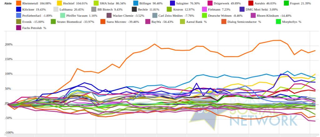 Rheinmetall 184,58% (Vorjahr: 114,15 Prozent) im Plus. Dahinter