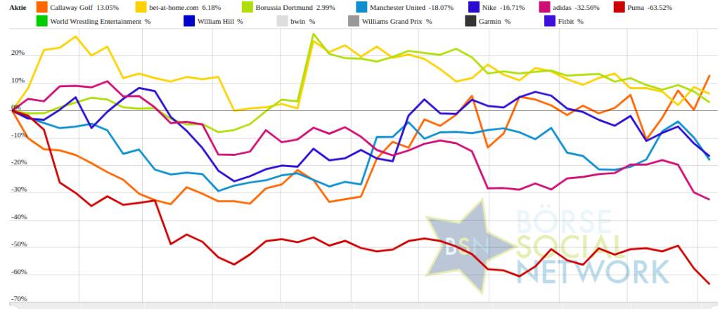 Weitere Highlights: Callaway Golf ist nun 3 Tage im Plus (20,32% Zuwachs von 8,81 auf 10,6), ebenso Puma 11 Tage im Minus (27,97% Verlust von 22,04 auf 15,88), Manchester United 5 Tage im Minus (9,14% Verlust von 14,77 auf 13,42), William Hill 3 Tage im Minus (0,92% Verlust von 3,16 auf 3,13), Nike 3 Tage im Minus (12,57% Verlust von 122,53 auf 107,13).