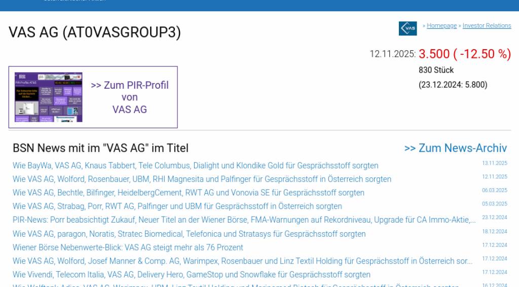 VAS AG am 12.11. -12,50%, Volumen 92% normaler Tage