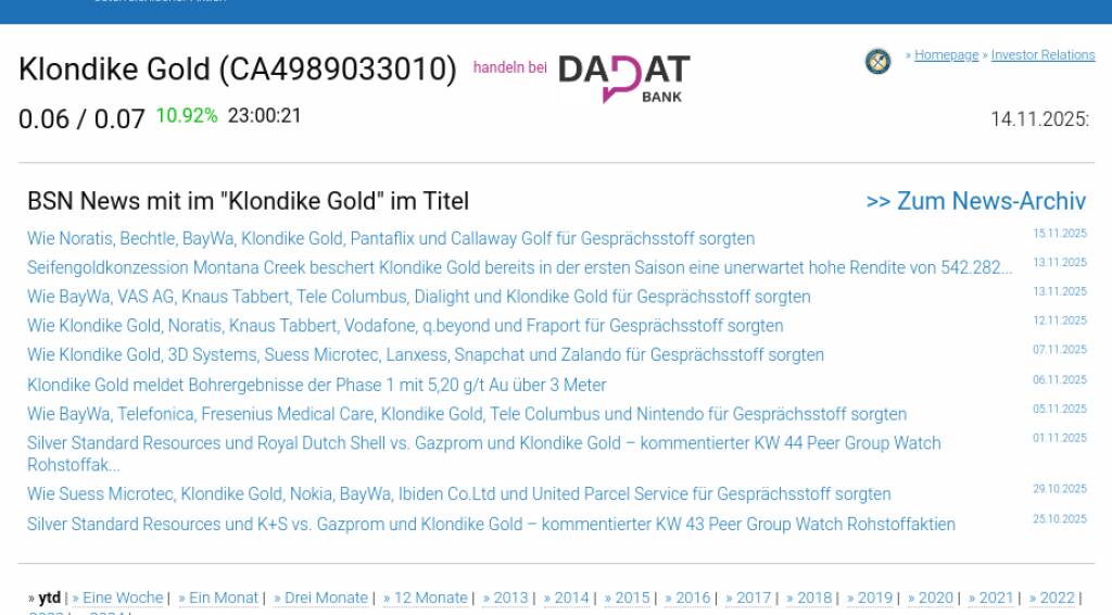 Klondike Gold am 14.11. -10,08%, Volumen 0% normaler Tage
