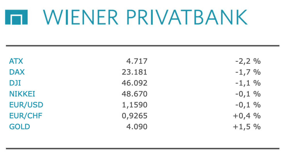 Aus den Morning News der Wiener Privatbank: "Am Wiener Aktienmarkt hat sich die Abwärtsbewegung der vergangenen Tage gestern Dienstag noch einmal beschleunigt. Marktteilnehmer verwiesen mit Blick auf die globale Risikoscheu auf die bevorstehenden Zahlen des Chipriesen Nvidia heute Mittwochabend sowie die US-Arbeitsmarktdaten morgen Donnerstag. Die Termine gelten als richtungsweisend für die Erwartungen in Bezug auf den KI-Boom beziehungsweise mögliche Zinssenkungen der US-Notenbank im Dezember. Der ATX gab in einem schwachen Börsenumfeld um 2,16 Prozent auf 4.716,63 Punkte nach. Für den ATX Prime ging es 2,05 Prozent auf 2.347,40 Punkte nach unten. Damit setzten sich auch in Wien die Gewinnmitnahmen fort, nachdem der Leitindex Ende vergangener Woche noch ein Jahreshoch markiert und das Rekordhoch bereits in Reichweite schien. Inzwischen sind die November-Gewinne jedoch weitgehend abgeschmolzen. Insgesamt bleiben Marktbeobachter dem Wiener Aktienmarkt gegenüber jedoch konstruktiv eingestellt. Die Bewertung des ATX sei auch nach dem jüngsten Jahreshoch noch als "solide" einzustufen - auch wenn kurzfristige Rücksetzer möglich seien, heißt es in einer Studie. Inzwischen sieht Morgan Stanley den österreichischen Aktienmarkt im westeuropäischen Vergleich für 2026 an der Spitze ihres quantitativen Ländermodells - unter anderem dank positiver Gewinnrevisionen, günstiger Bewertungen und geringer US-Abhängigkeit. Insgesamt erwarten die Analysten jedoch, dass Europa hinter dem US-Markt zurückbleibt. Im ATX kamen am Berichtstag Industrietitel und Banken überdurchschnittlich unter Druck. Sie zollten ihrem bisher guten Jahresverlauf Tribut. Bawag , Andritz und RBI gaben dabei jeweils mehr als zweieinhalb Prozent ab. Schwächer schlossen auch Versorger: Verbund büßten knapp 2,5 Prozent ein. Die Bundesregierung hat sich auf einen neuen Entwurf für das Elektrizitätswirtschaftsgesetz (ElWG) geeinigt. Demnach sollten Stromanbieter verpflichtet werden, Preissenkungen auf den Großhandelsmärkten innerhalb von sechs Monaten an die Kunden weiterzugeben. Damit das Strommarktgesetz in Kraft tritt, braucht es im Nationalrat eine Zweidrittelmehrheit - also die Stimmen von entweder der FPÖ oder den Grünen.