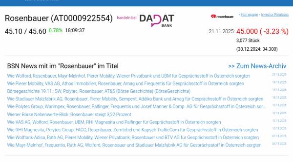Aktien auf dem Radar:voestalpine, AT&S, Andritz, RHI Magnesita, Austriacard Holdings AG, Pierer Mobility, Rosgix, Addiko Bank, CA Immo, Rosenbauer, FACC, Lenzing, OMV, EVN, Mayr-Melnhof, Wolford, Zumtobel, Gurktaler AG Stamm, Gurktaler AG VZ, Polytec Group, RBI, VIG, Wienerberger, Amag, UBM, Palfinger, EuroTeleSites AG, Oberbank AG Stamm, BKS Bank Stamm, Josef Manner & Comp. AG, SW Umwelttechnik.