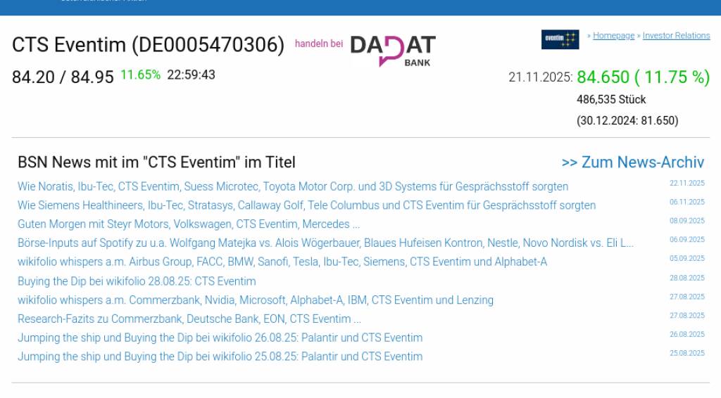 CTS Eventim am 21.11. 11,75%, Volumen 299% normaler Tage