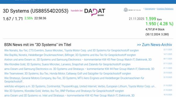 3D Systems am 21.11. 4,28%, Volumen 128% normaler Tage