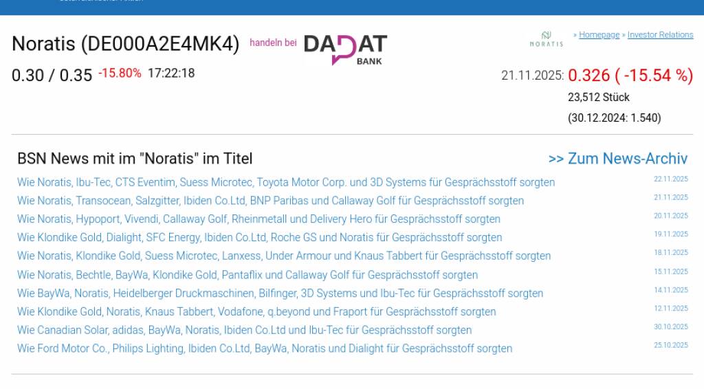 Noratis am 21.11. -15,54%, Volumen 400% normaler Tage